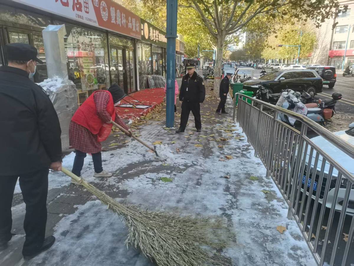 當然,清除積雪僅靠環衛工人的力量是遠遠不夠的,也需要沿街商戶和公共單位的配合。12月13日一大早,二七區城市管理執法大隊就開始組織執法中隊對沿街商戶的除雪工作進行全面督導檢查,執法人員通過發放《致沿街商戶的一封信》告知商戶們要及時清掃門前積雪,對未能及時履行清掃義務的督促其相關責任人現場整改。