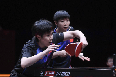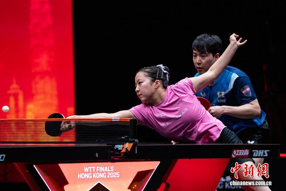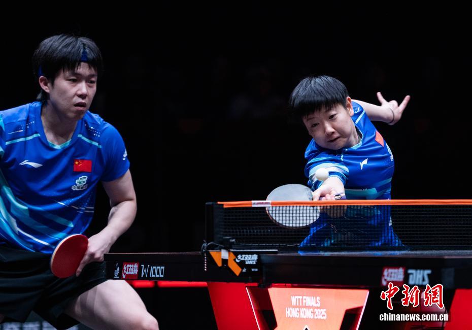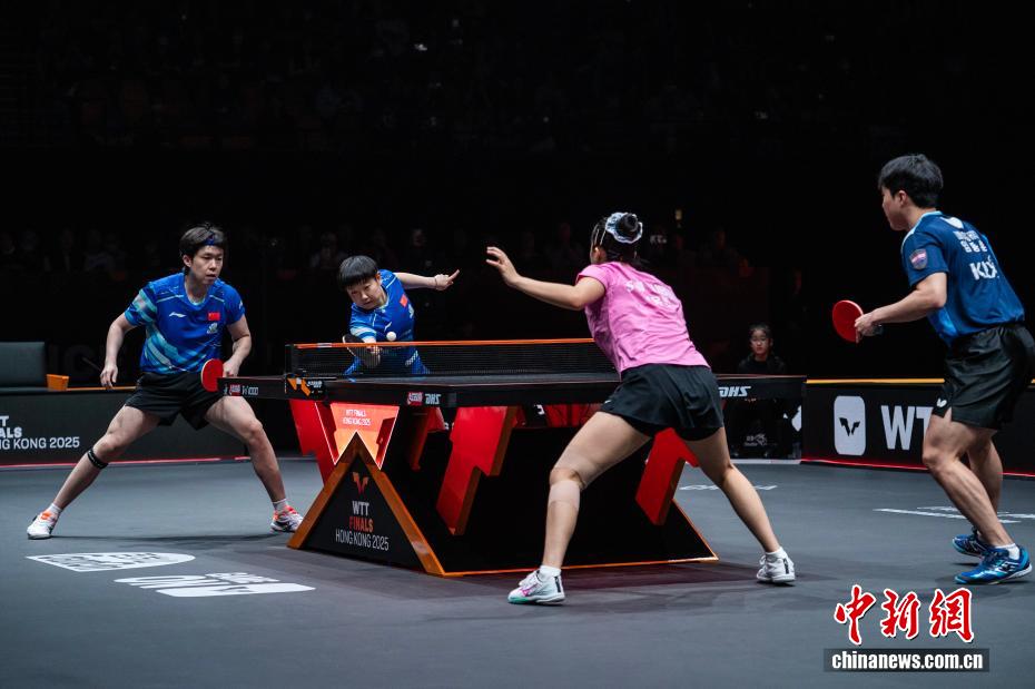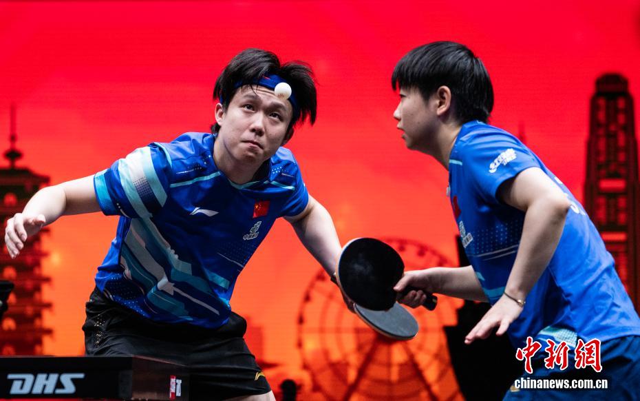 圖為中國選手王楚欽(遠端左)、孫穎莎(遠端右)在比賽中回球。