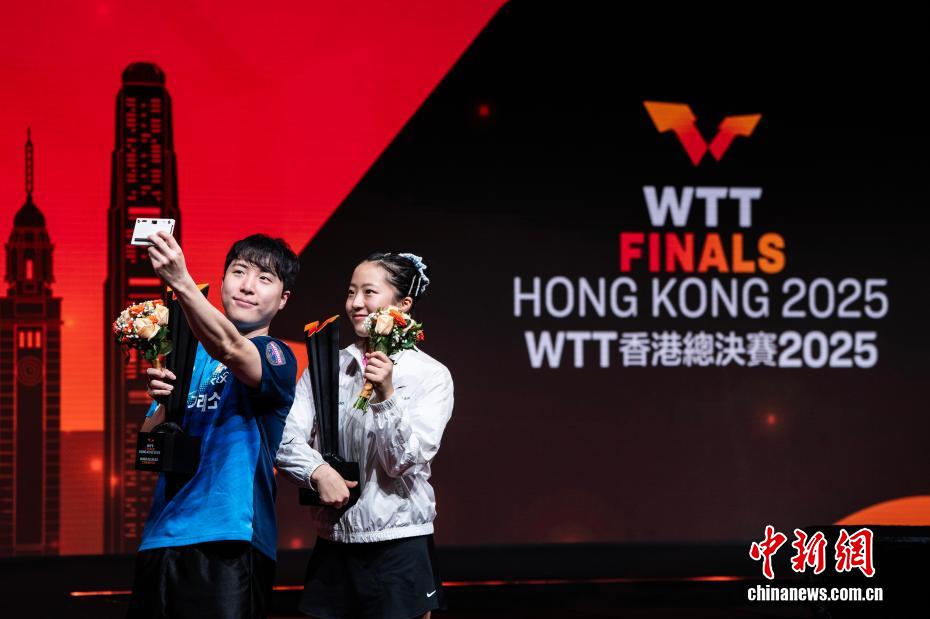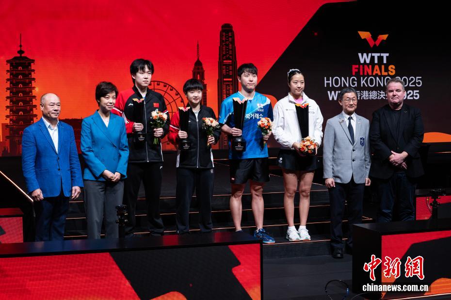 12月13日晚,世界乒乓球職業大聯盟(WTT)香港總決賽混雙決賽在香港體育館舉行,女單半決賽因傷退賽的中國選手孫穎莎帶傷出戰,攜手中國選手王楚欽迎戰韓國選手林鐘勛/申裕斌,“莎頭組合”最終0:3不敵對手,獲得亞軍。圖為頒獎儀式上,中國選手王楚欽(左三)/孫穎莎(左四),獲得冠軍的韓國選手林鐘勛(右四)/申裕斌(右三)和頒獎嘉賓合影。