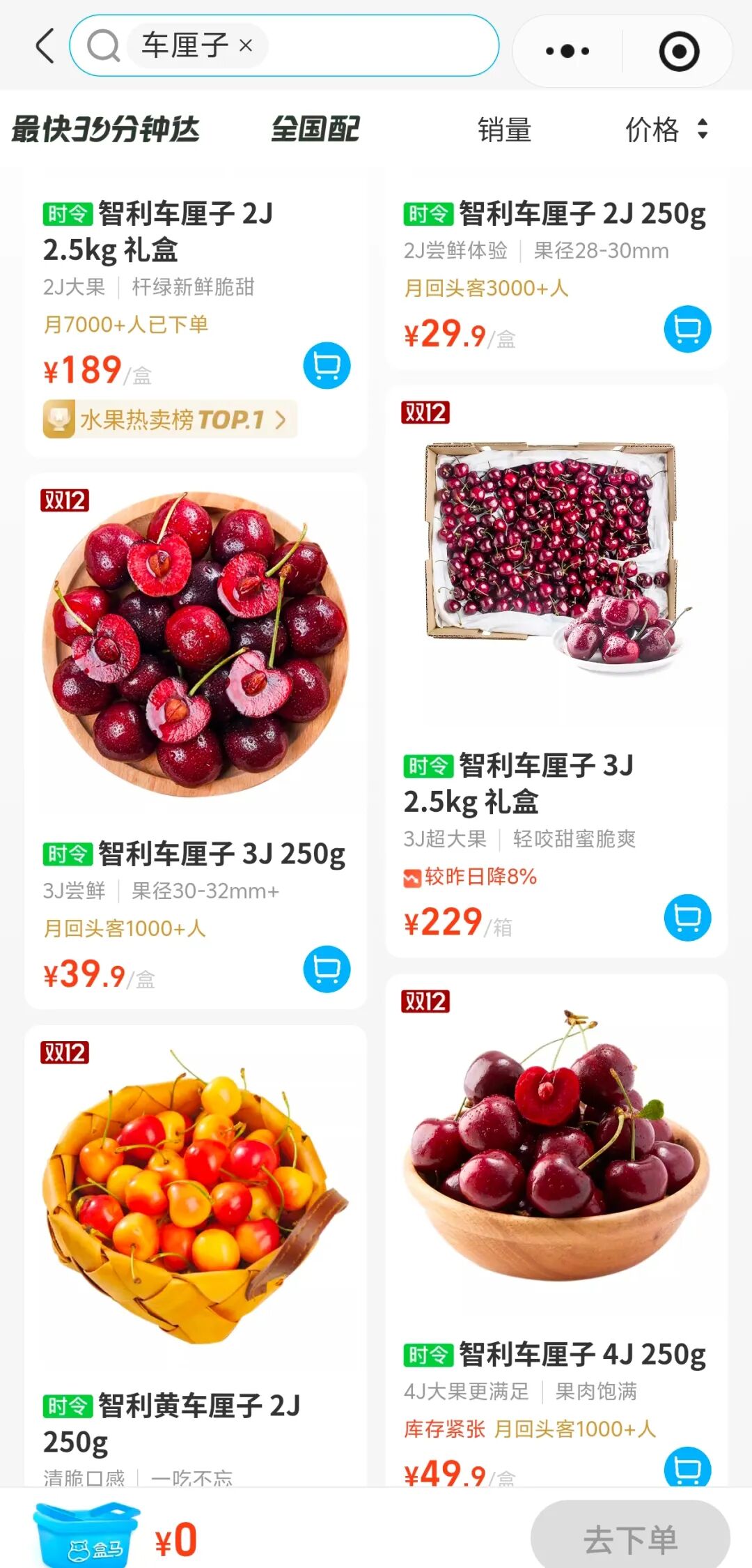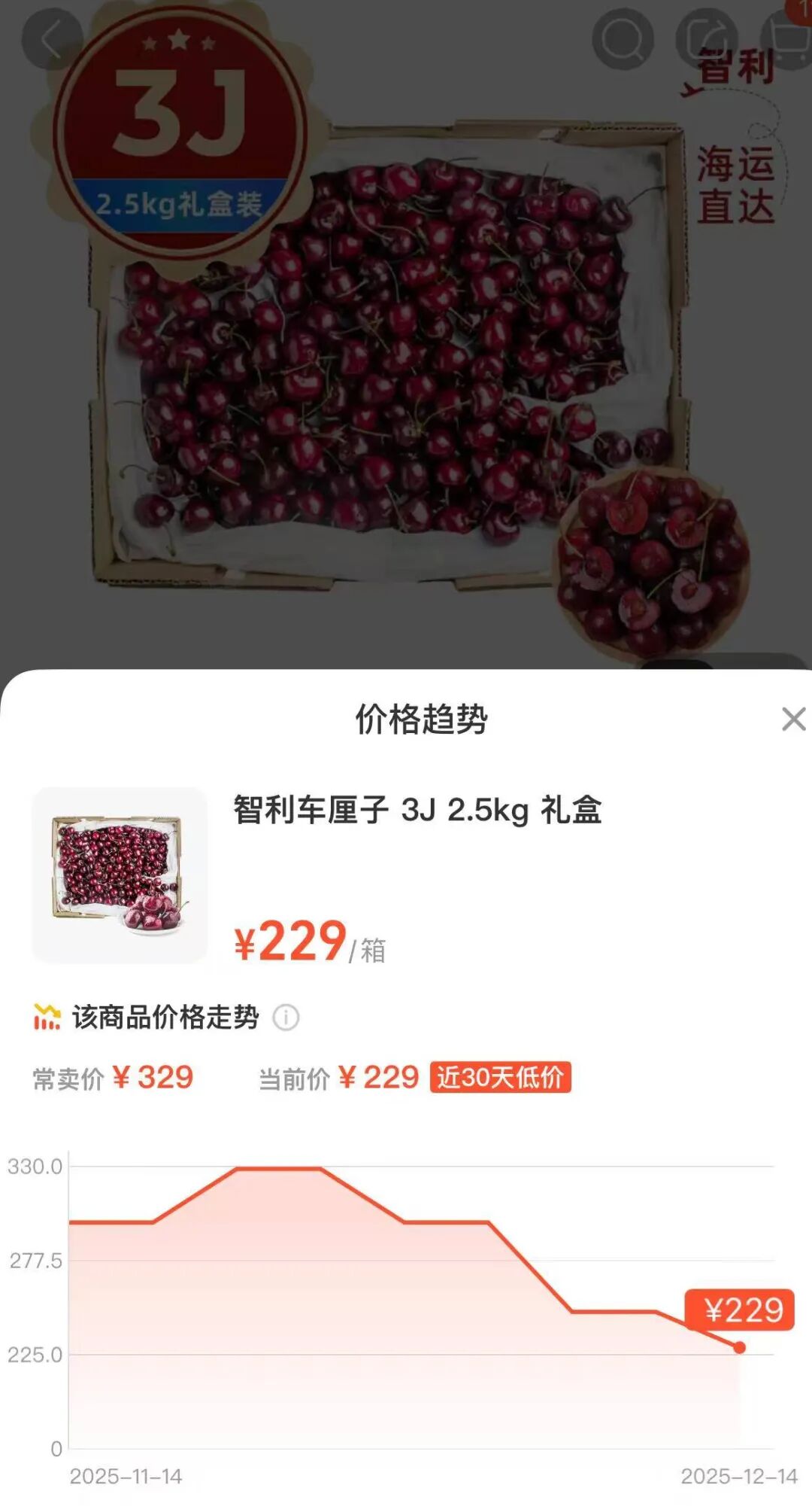 小福注意到,盒馬平臺已上線海運直達的車厘子禮盒,其中如智利車厘子3J級的2.5kg禮盒已達到近30天最低價229元。