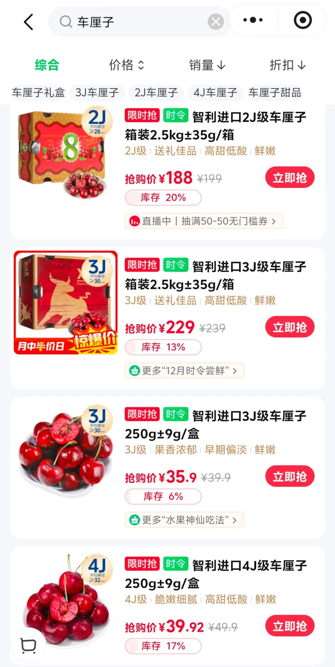 小福搜索深圳多個生鮮超市線上平臺,發現已有車厘子開售,規格從“2J”到“4J”都有,粗略換算,2J級箱裝車厘子價格在37元/斤左右,3J級箱裝車厘子價格45元/斤左右,4J級箱裝車厘子價格80元/斤左右。