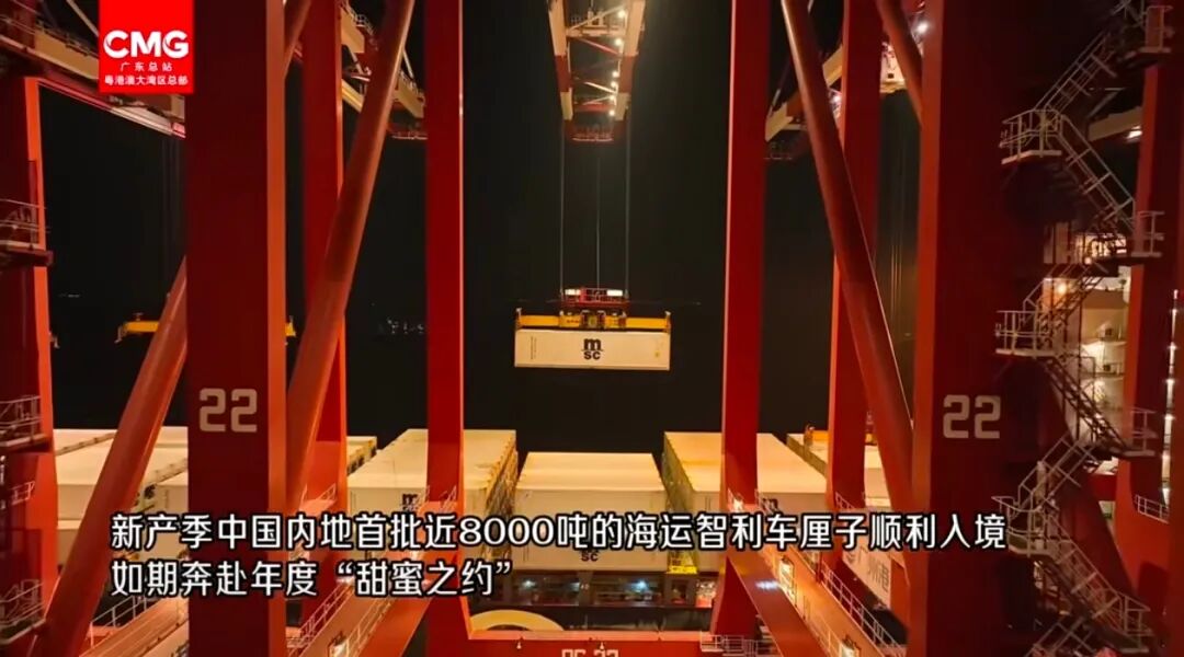 廣州南沙口岸是國內車厘子第一大進口口岸。此次新產季預計共有19艘“車厘子快線”貨船、超1萬柜進口智利車厘子運抵,其中高峰期每周近1000柜智利車厘子到港。