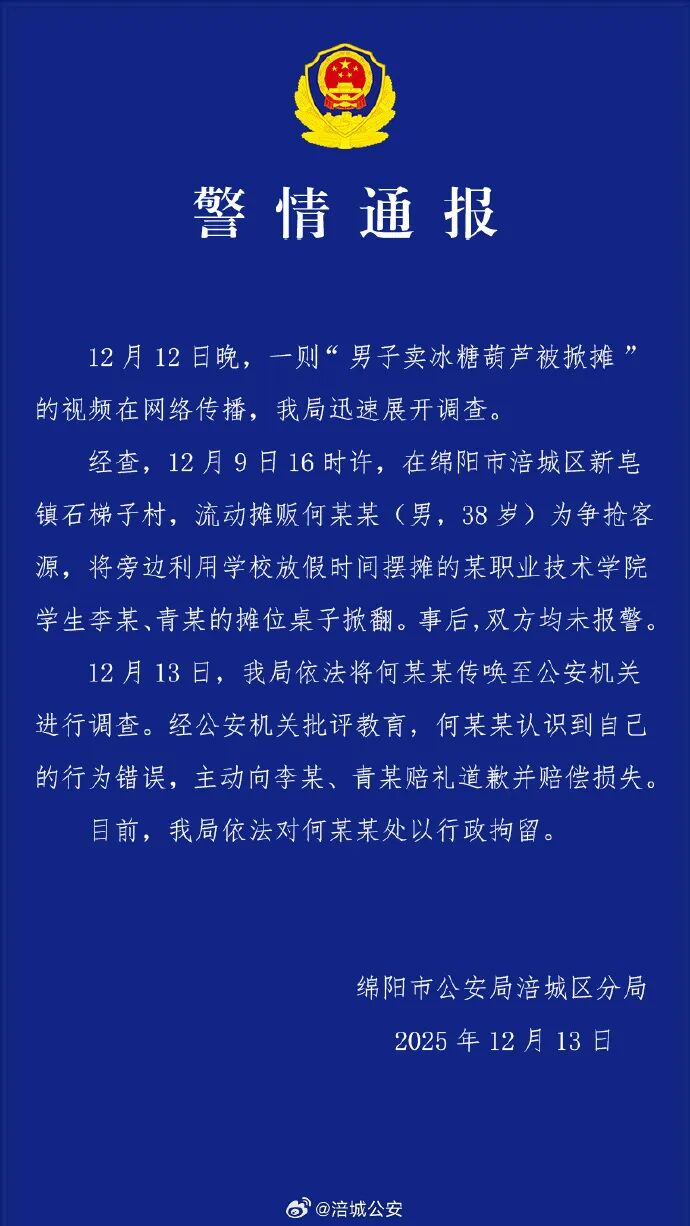 12月12日晚,一則“男子賣冰糖葫蘆被掀攤”的視頻在網絡傳播,我局迅速展開調查。