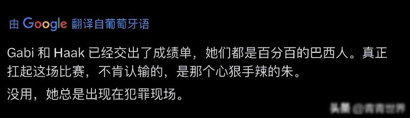 那天科內利亞諾隊打敗了奧薩斯科隊,比分是三比一,朱婷出手三十二次,成功打進十三個球,加比拿到十八分,但大家很少提到加比的表現,反而很多巴西網友在評論區留言,說看到朱婷扣球就想起二零一六年那場比賽,那是中國和巴西之間的對決,雙方打滿了五局,最后巴西隊在自家門口輸掉了比賽。