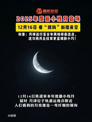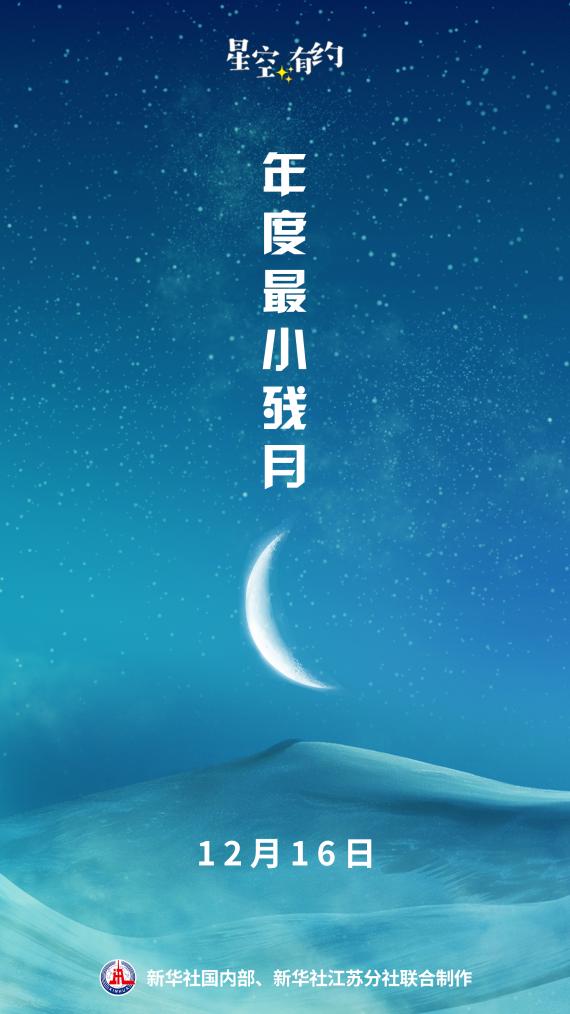 新華社南京12月14日電(記者王玨玢、邱冰清)12月16日將迎來本年度最小殘月,屆時,月球位于軌道遠地點附近,人們看到的月亮像是一彎纖細的銀鉤。