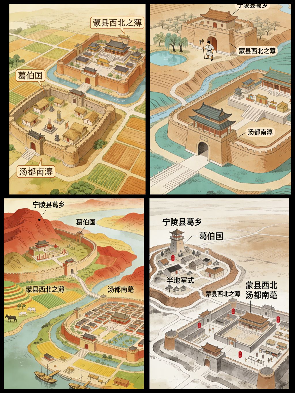 《孟子·滕文公下》云:“湯居亳,與葛為鄰。”又云:“湯始征,自葛載。”《尚書·仲虺(huǐ悔)之誥》云:“葛伯仇餉,初征自葛。”《漢書·地理志》對葛亦有解釋:“寧陵,故葛伯國,今葛鄉是也。”葛鄉即今寧陵縣北15華里的葛伯屯。正因為葛與亳相距很近,國與國接壤,所以“湯使亳眾往為之耕,老弱饋食。”如西亳偃師說,與葛相距800余里,如何助耕?又如何送飯?如鄭亳說,距葛雖沒偃師遠,但相距400余里,同樣無法助耕和送飯。