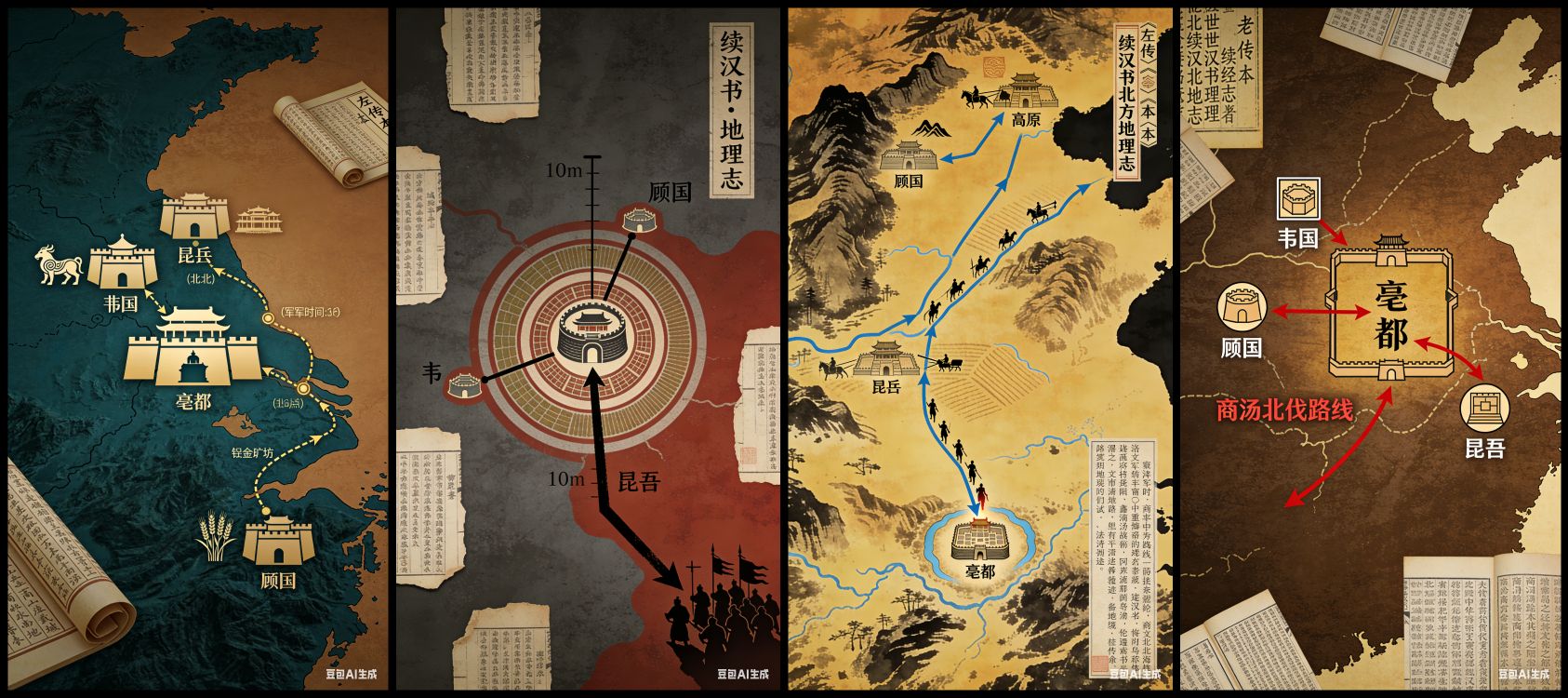 3、以湯之經略北方證之。湯所伐國,韋、顧、昆吾、夏桀,皆在北方。昆吾之墟,地在衛國(漢東郡濮陽城內),《左傳》《世本》說當可據。而韋國,《鄭箋(jiān堅)》以為豕(shǐ史)韋。按《續漢書·地理志》:東郡白馬縣有韋鄉。杜預亦云,白馬縣東南有韋城,古豕韋氏之國。又,白馬之津,《史記·曹相國世家》亦謂之圍津。是韋與昆吾,實為鄰國,與亳相距不過二百里。顧地無考[注:在今鄄(juàn眷)城東北],《漢書·古今人表》作“鼓”。案,殷墟卜辭云:“王步于 。”當即鼓字。卜辭所載地名,大抵在大河南北數百里內,知亦距韋與昆吾不遠。且顧與昆吾,《鄭語》均以為己姓之國,故衛之帝丘城外有戎州己氏,而梁國蒙薄之北,漢亦置己氏縣。疑古顧國,當在昆吾之南、蒙薄之北。然則,亳與湯之世,居國之北境,故湯自商丘徙此,以疆理北方,逮北伐韋、顧,遂及昆吾,于是商境始北抵河,王業之成,基于此矣。湯之時,方有事北方,決無自商丘南徙谷熟之理,至偃師之地,更與諸國風馬牛不相及。其證三也。 自來說湯都者,紛歧無定說,故舉此三證質之。