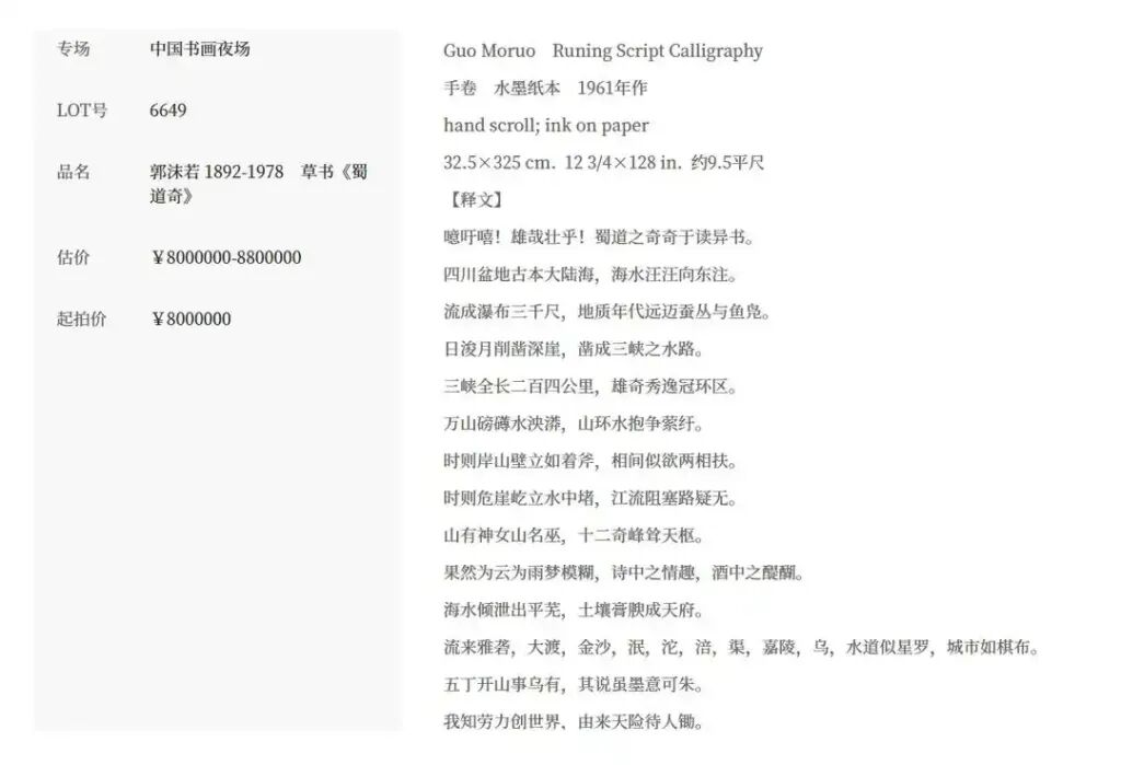 近日,郭沫若書法手卷《蜀道奇》將亮相北京保利二十周年秋拍,12月16日開拍,起拍價800萬元。其女郭庶英委托律師發布聲明,稱該作品為父親1961年題贈自己的私藏,從未轉讓或授權,目前已遺失并報警,質疑拍賣為無權處分,要求保利中止拍賣、返還作品。