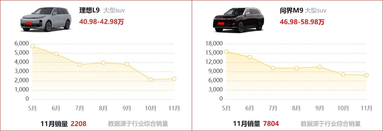不知道您有沒有發現,國內車市不少“當時現象級的9系車型”,或隨著自家推出低端產品之后,或受市場競爭、消費者喜好轉變和審美疲勞影響,銷量正呈逐漸下滑趨勢,比如理想L9,比如問界M9,我們先來看看這兩款車型近半年左右的銷量曲線。