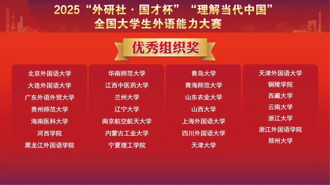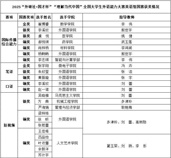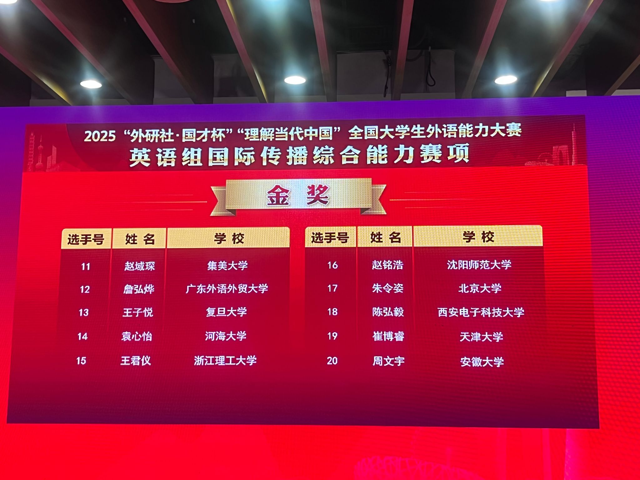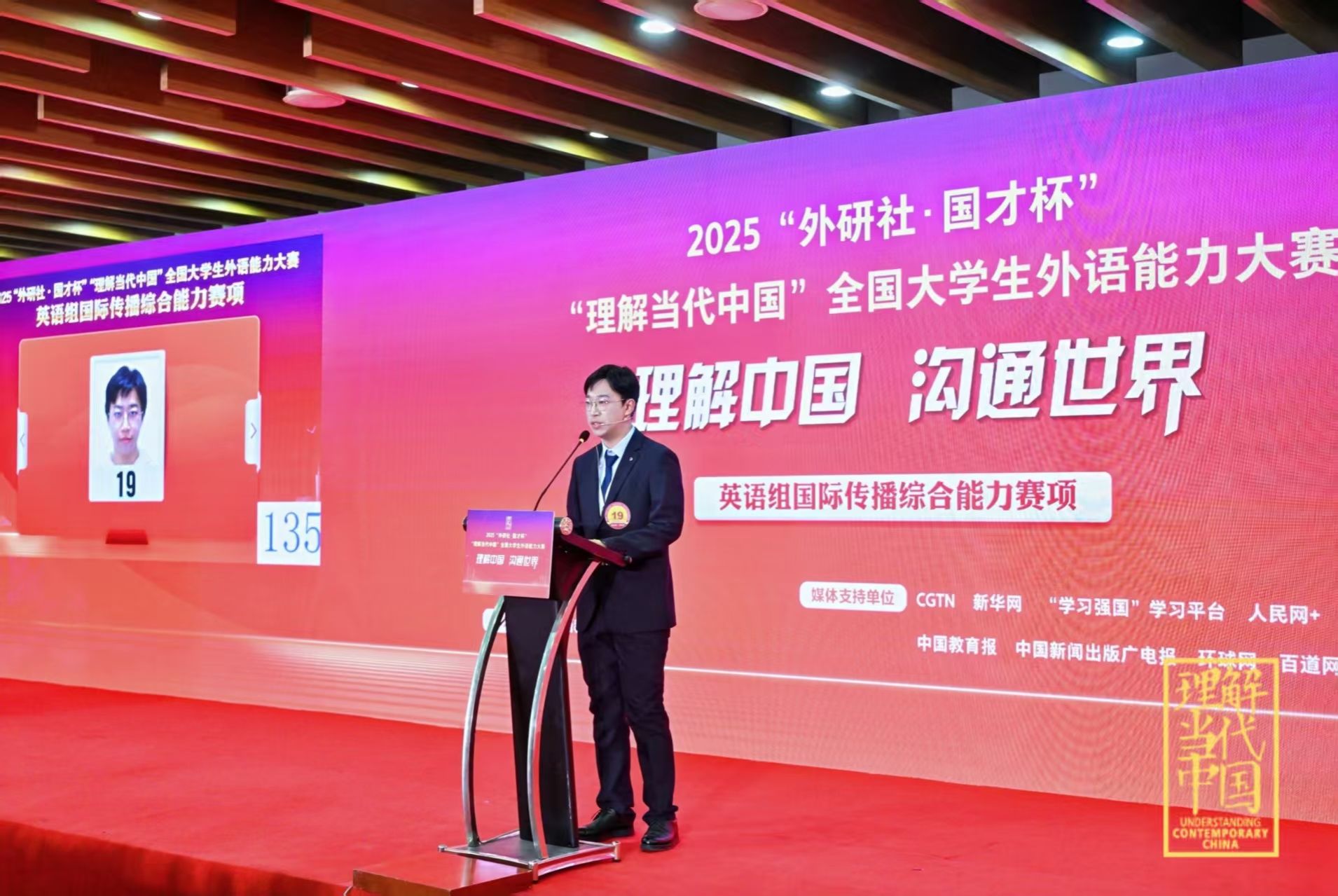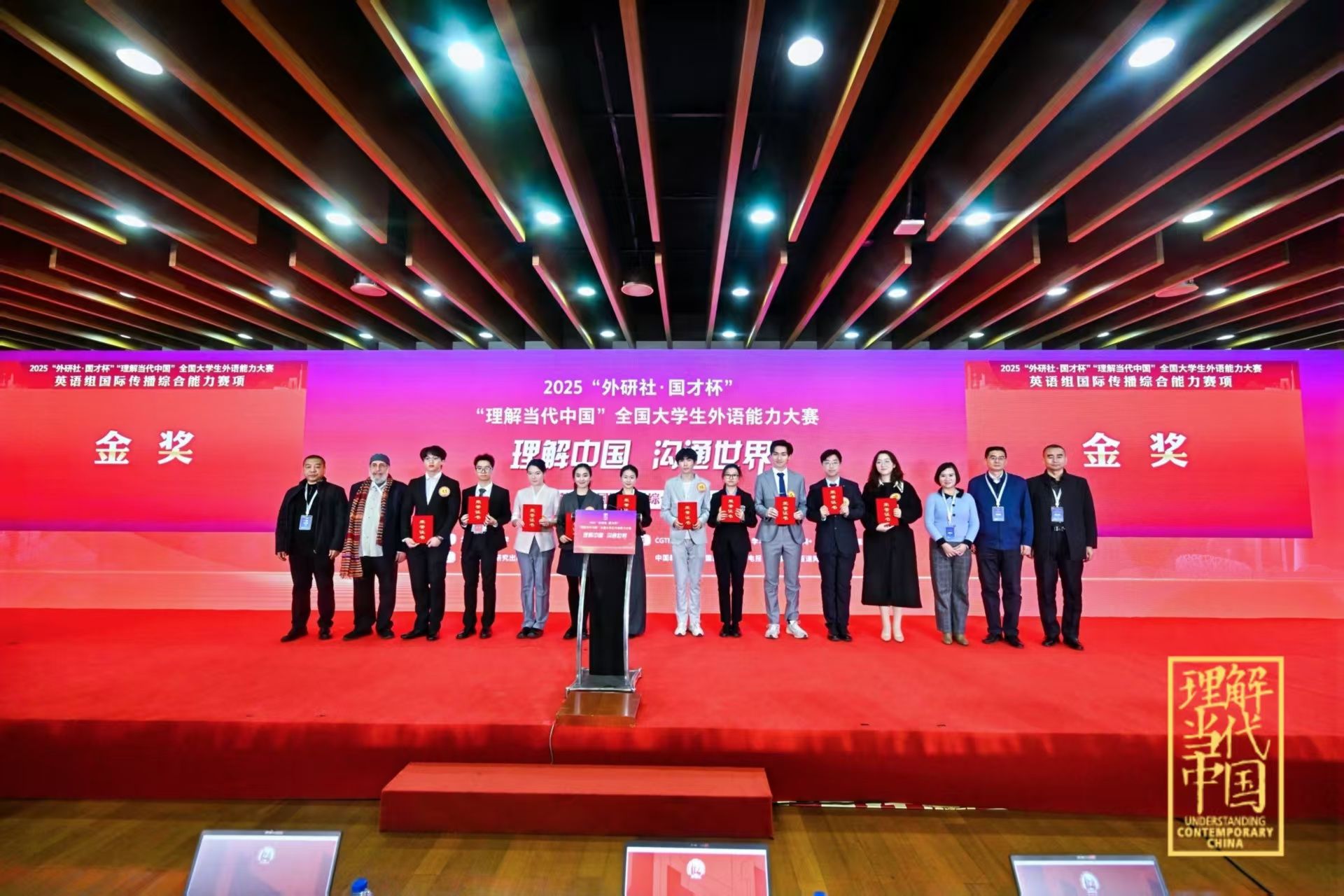 本站訊12月8日,2025“外研社·國(guó)才杯”“理解當(dāng)代中國(guó)”全國(guó)大學(xué)生外語(yǔ)能力大賽全國(guó)總決賽圓滿落幕。我校學(xué)子在國(guó)賽舞臺(tái)上與來(lái)自全國(guó)各高校的優(yōu)秀學(xué)子同臺(tái)競(jìng)技,在英語(yǔ)組國(guó)際傳播綜合能力、筆譯、口譯和短視頻四個(gè)賽項(xiàng)中成績(jī)優(yōu)異,共摘得2金4銀9銅總計(jì)15項(xiàng)國(guó)家級(jí)獎(jiǎng)項(xiàng),在金獎(jiǎng)數(shù)量上有所突破。其中國(guó)際傳播綜合能力賽項(xiàng)獲得1金2銀4銅,筆譯賽項(xiàng)獲得1金1銀1銅,口譯賽項(xiàng)獲得2銅,短視頻賽項(xiàng)獲得1銀2銅。