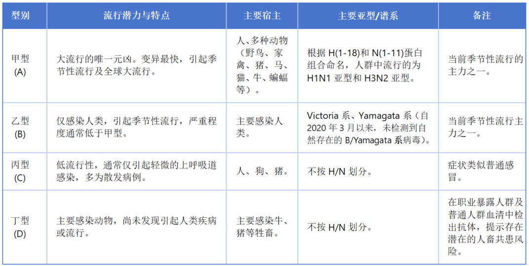 流感病毒并非“單打獨斗”,而是有一個龐大的家族,它分為甲(A)、乙(B)、丙(C)、丁(D)四個型,平時引起人群季節性流感的主要是甲、乙型病毒。