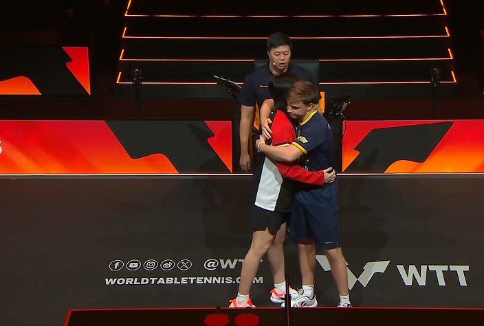 雖然王楚欽宣布退賽,但他還是來到了比賽現場,給了舉辦方、對手莫雷加德很大的尊重。莫雷加德穿著球衣上場。王楚欽則穿著外套,明顯沒打算比賽。莫雷加德也知道了王楚欽的意思。兩人擁抱在一起。莫雷加德安慰了王楚欽。王楚欽則祝福了莫雷加德。王楚欽還跟莫雷加德的教練打了招呼,非常有禮貌。