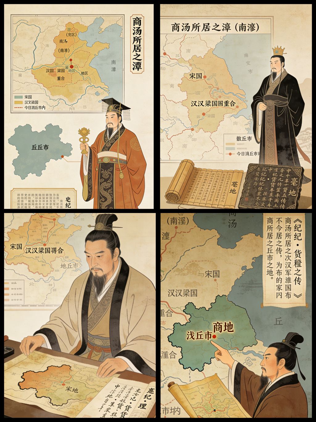 《史記·貨殖列傳》有關漢之梁國、春秋之宋國和商湯的居住地的記載:“夫鴻溝以東,芒、碭以北,屬巨野,此梁、宋也。陶、睢陽亦一都會也。昔堯作于成陽,舜漁于雷澤,湯止于亳。”
