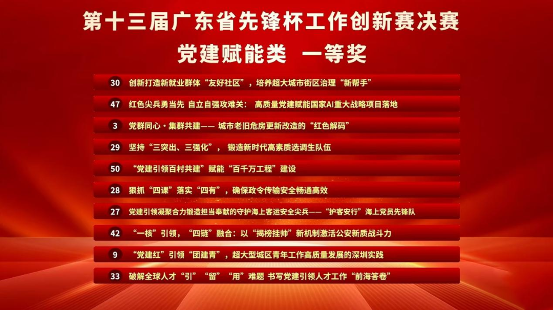 近日,第十三屆廣東省“先鋒杯”工作創(chuàng)新賽決賽順利舉辦。該賽事由省直機關(guān)工委、省委改革辦、省總工會、團省委、省婦聯(lián)聯(lián)合主辦,是全省最具影響力的工作創(chuàng)新標桿賽事。經(jīng)過激烈角逐,龍華區(qū)群團工作部黨支部《“黨建紅”引領(lǐng)“團建青”,超大型城區(qū)青年工作高質(zhì)量發(fā)展的深圳實踐》項目,憑借扎實的創(chuàng)新舉措與實踐成效,從全省21個地市黨政機關(guān)以及省直、中直駐粵單位、約5000個參賽項目、24000多名參賽人員中層層突圍、脫穎而出,最終站上省賽最高領(lǐng)獎臺,獲全省黨建賦能組一等獎。此為近年來龍華區(qū)首次,以及今年全市群團系統(tǒng)唯一獲此殊榮。
