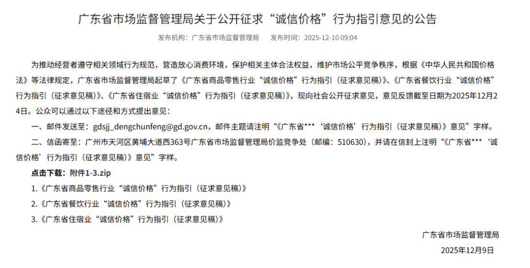 日前,《廣東省商品零售行業“誠信價格”行為指引(征求意見稿)》《廣東省餐飲行業“誠信價格”行為指引(征求意見稿)》《廣東省住宿業“誠信價格”行為指引(征求意見稿)》3份意見稿向社會公開征求意見,意見反饋截止日期為2025年12月24日。