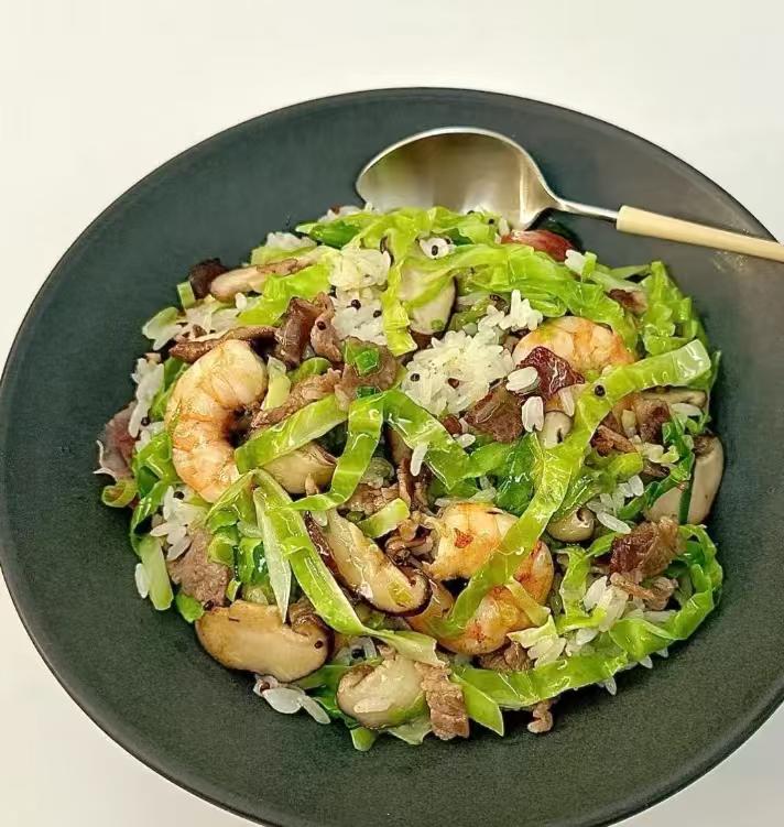 ②油熱下蔥、姜、干辣椒爆香,倒入包菜、事先油煎好的蝦,胡蘿卜絲翻炒。