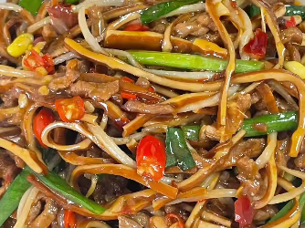 ③倒入粉絲,加入1勺生抽、半勺老抽、1勺蠔油、少許鹽和雞精。