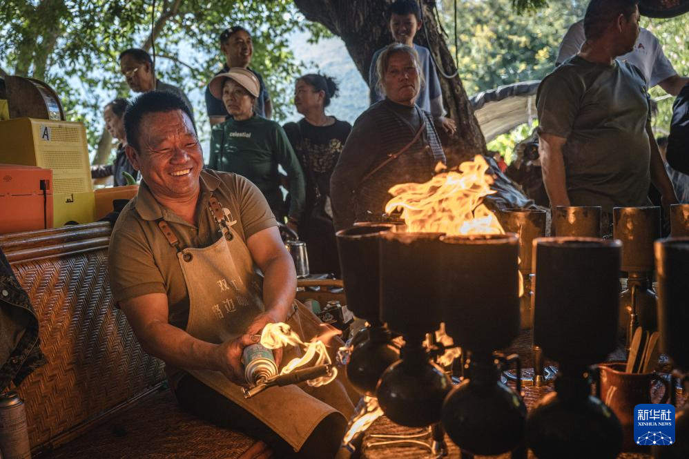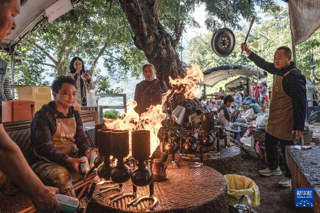 11月15日,在云南省保山市隆陽區(qū)芒寬鄉(xiāng)的“路邊咖啡館”,店員(右)敲鑼配合咖啡師制作“火燒咖啡”。新華社記者 王冠森 攝