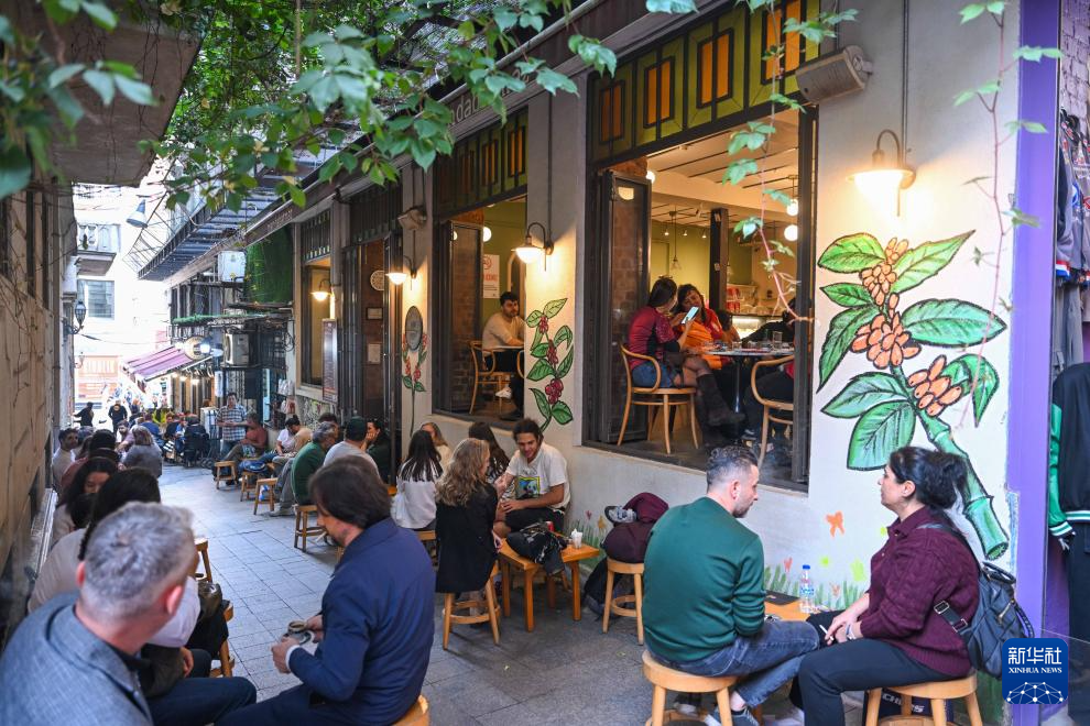 11月22日,顧客們在土耳其伊斯坦布爾的曼達(dá)巴特馬茲咖啡店外巷道里喝咖啡。新華社記者 劉磊 攝