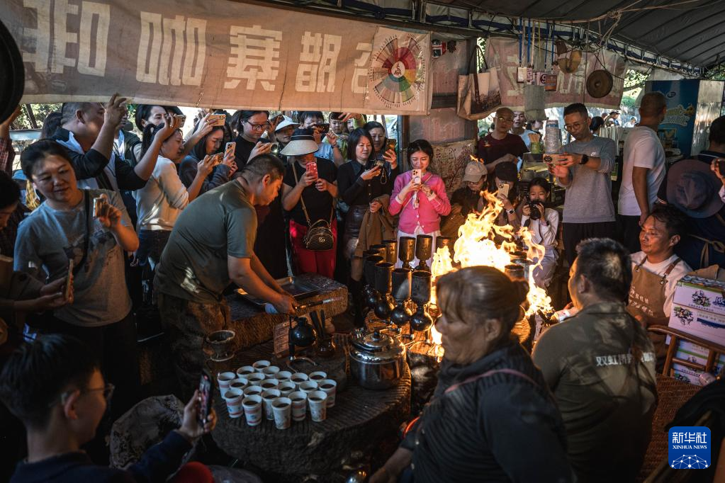 11月15日,顧客在位于云南省保山市隆陽區(qū)芒寬鄉(xiāng)的“路邊咖啡館”拍攝“火燒咖啡”制作過程。新華社記者 王冠森 攝