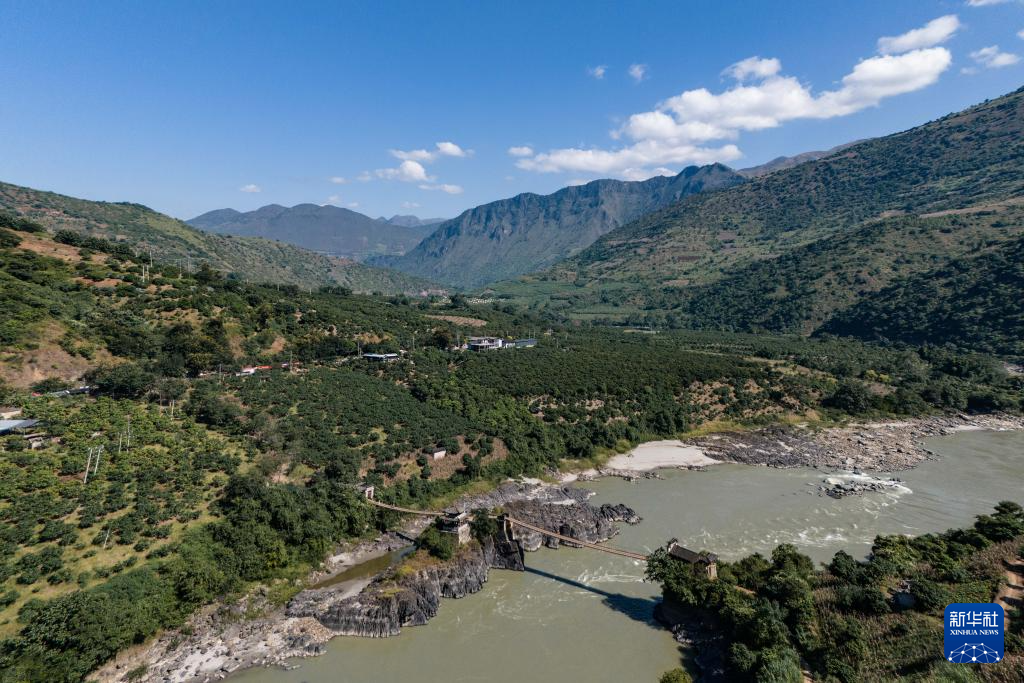 這是11月15日在云南省保山市隆陽區(qū)芒寬鄉(xiāng)拍攝的橫跨怒江的雙虹橋,李金合經(jīng)營的“路邊咖啡館”位于雙虹橋邊(無人機(jī)照片)。新華社記者 高詠薇 攝