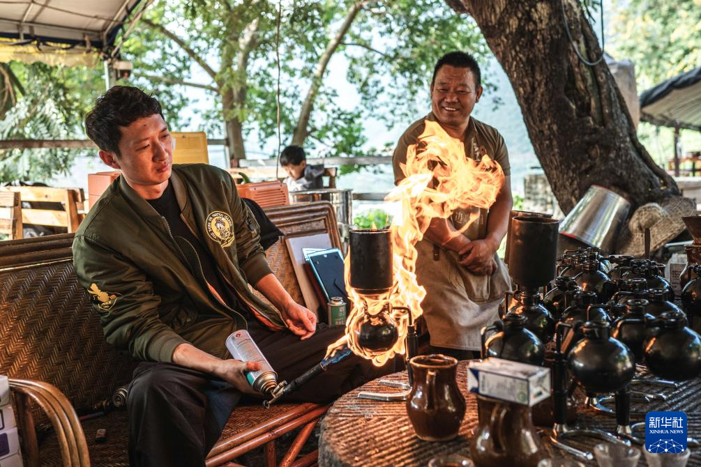 噴槍的火舌增溫,虹吸壺內(nèi)的咖啡粉隨沸水翻動。峽谷里獨(dú)特的咖啡萃取方式和怒江水一同攜著咖香,流向遠(yuǎn)方。隨著“火燒咖啡”走紅網(wǎng)絡(luò),咖叔也有了知名度。