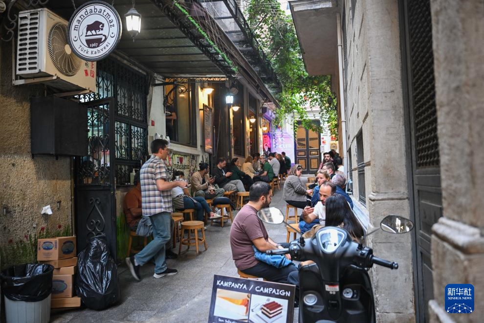 11月22日,顧客們在土耳其伊斯坦布爾的曼達(dá)巴特馬茲咖啡店外的巷道里喝咖啡。新華社記者 劉磊 攝