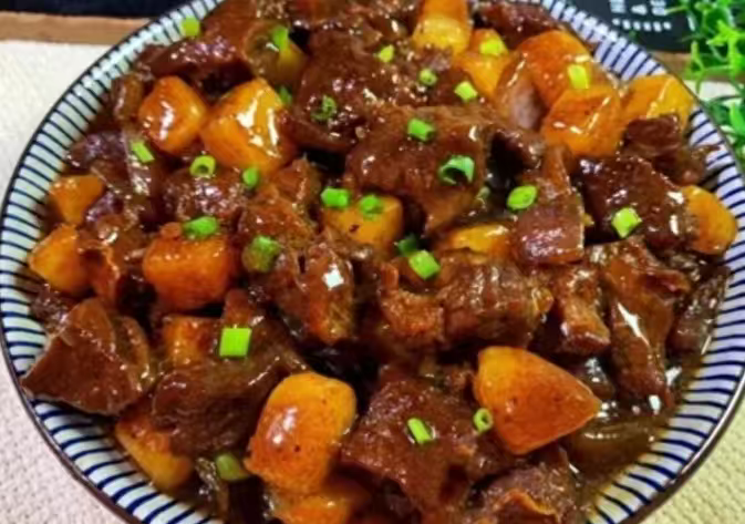(5)鍋中熱油下入腌制好的牛肉塊翻炒片刻,再加入煎熟的土豆塊。