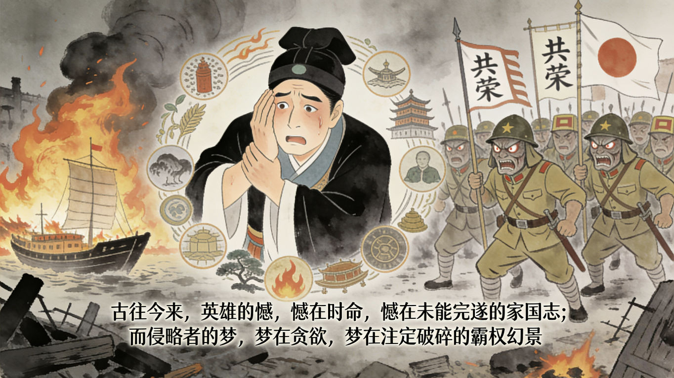 古往今來,英雄的憾,憾在時命,憾在未能完遂的家國志;而侵略者的夢,夢在貪欲,夢在注定破碎的霸權幻景。周郎的玉碎,碎得悲壯;倭寇的蚍蜉夢,醒得必然——畢竟?……
