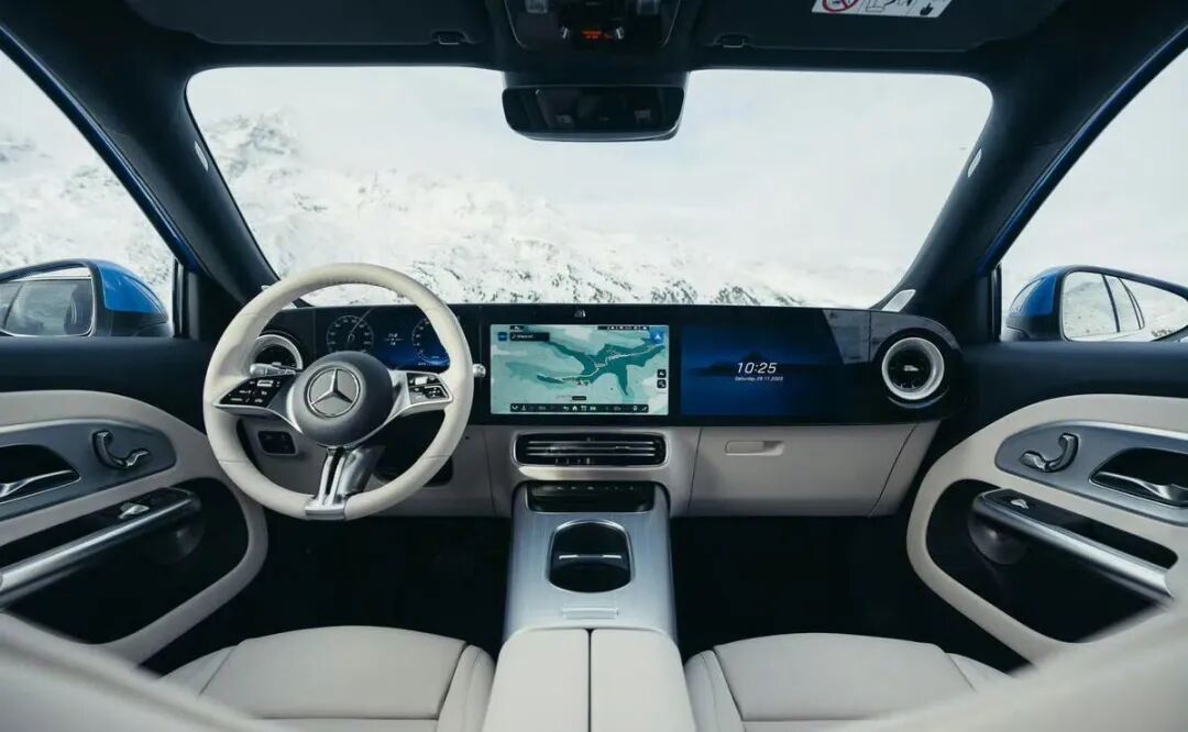 內飾是這臺車最大的亮點,跟之前的CLA一樣,也采用奔馳全新的三聯屏設計,一個10.25英寸的液晶屏,兩個14英寸的中屏和副駕屏組成。
