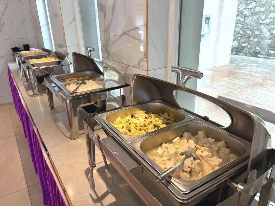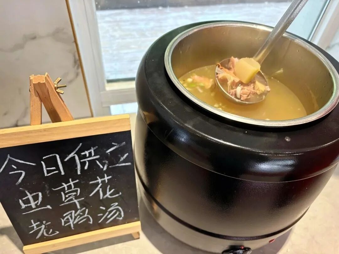 每天中午12:30至14:00,提供免費簡餐,滋補蟲草老鴨湯鮮醇入味,搭配松軟的茯苓饅頭,還有清爽涼菜、可口的熱菜和米飯,均衡營養(yǎng)又飽腹。