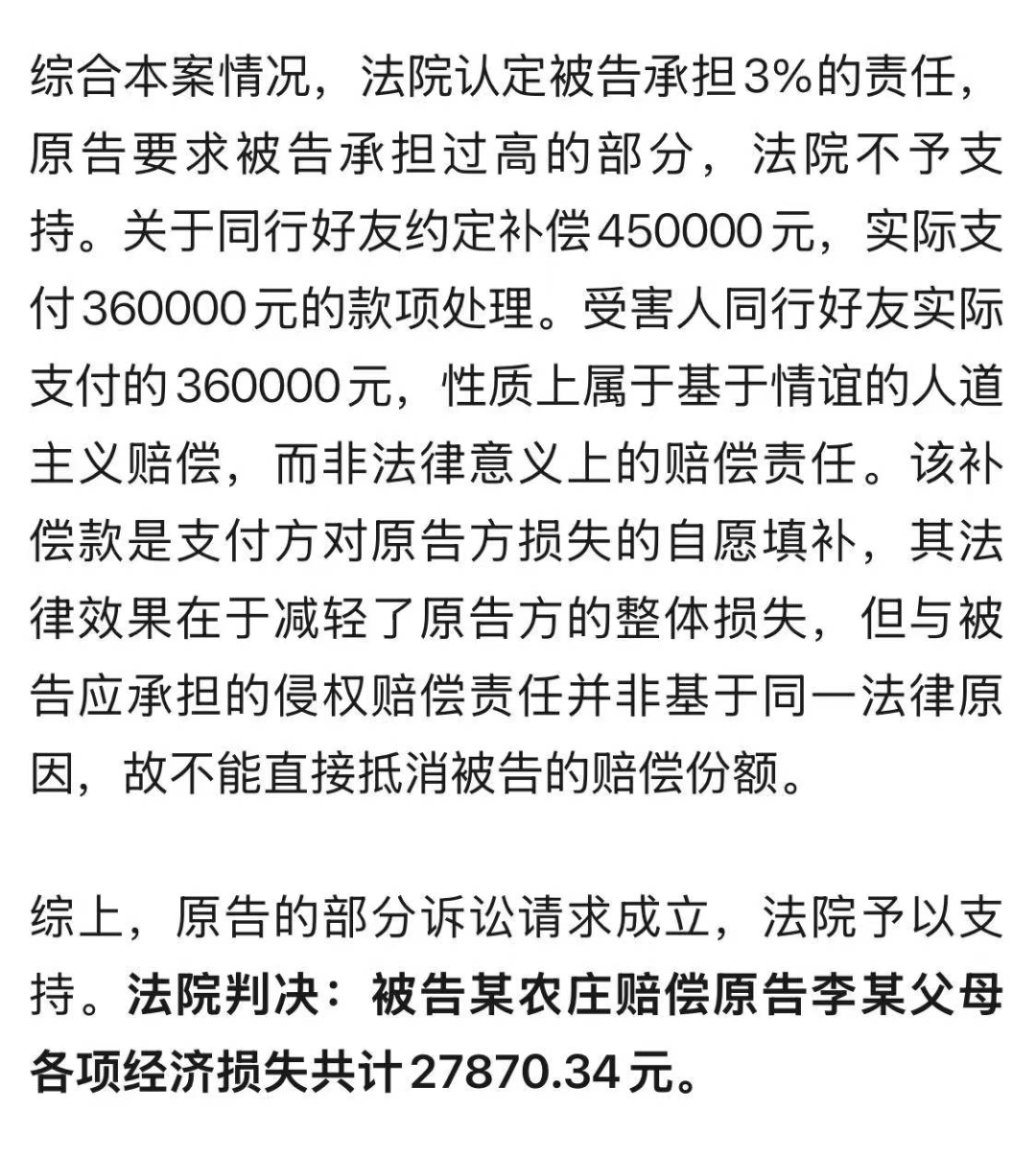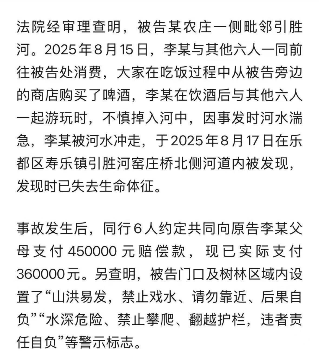 事發(fā)后,同行6人約定向李某家屬賠償45萬元。此后,李某家屬將農(nóng)莊起訴至法院,索賠46萬余元。