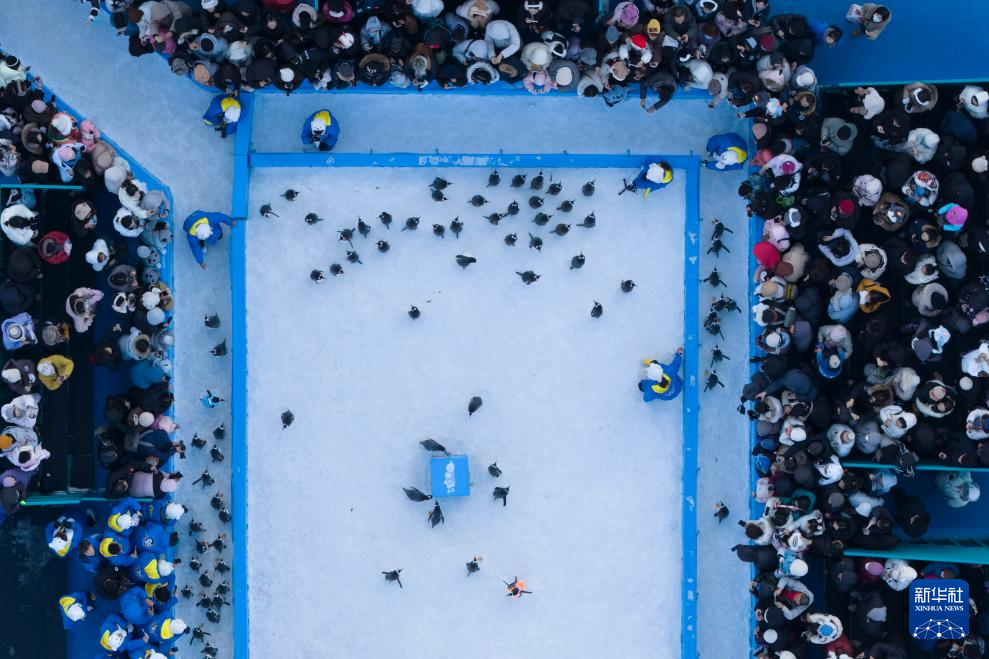 12月13日,人們在哈爾濱極地公園觀看企鵝巡游(無人機照片)。