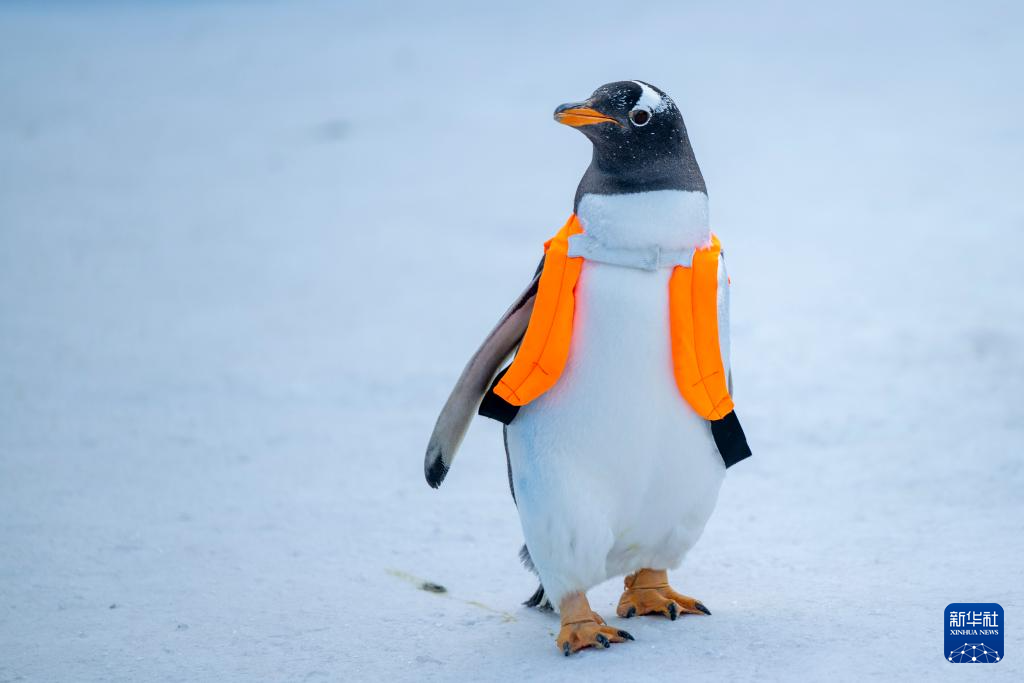 12月13日,哈爾濱極地公園的企鵝在戶外進行巡游。