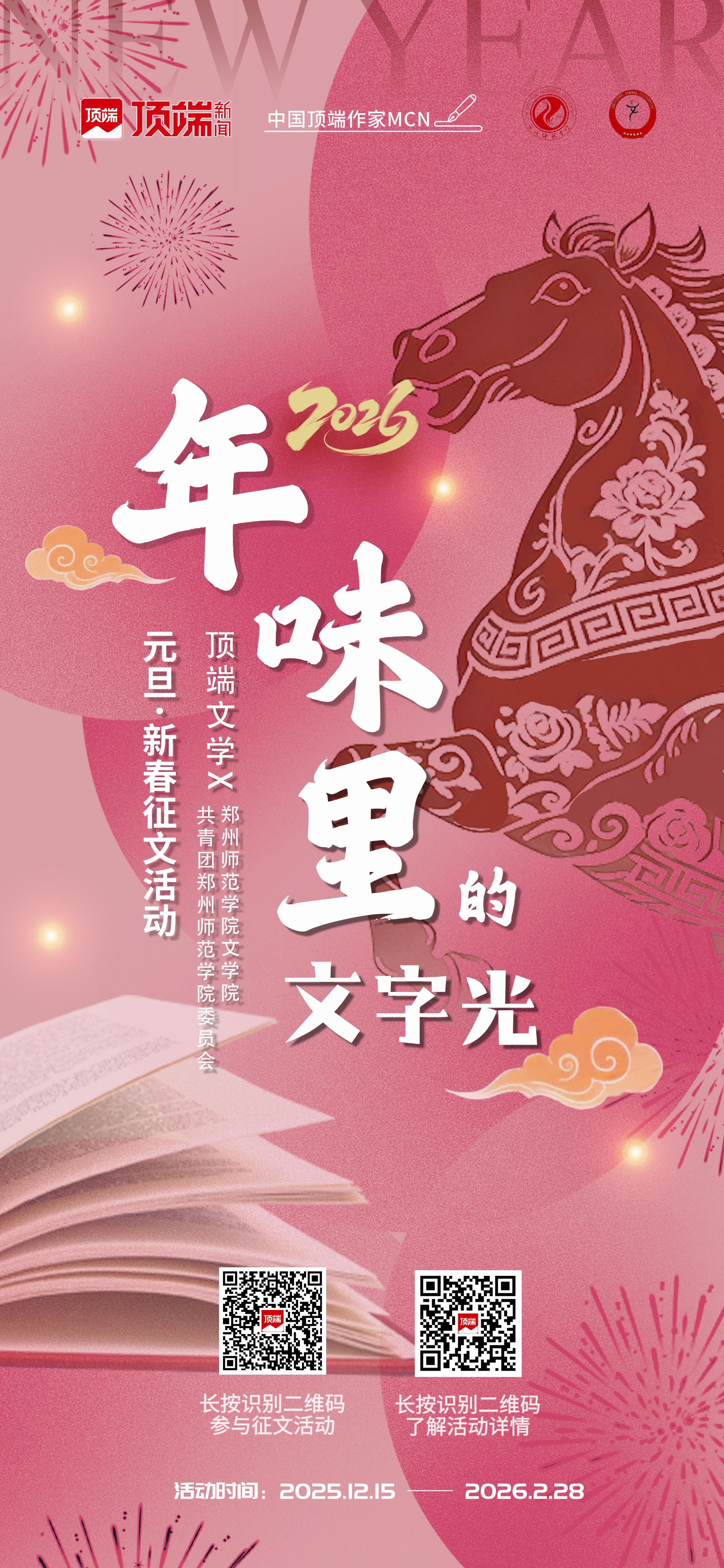 元旦?春節是承載民俗文化、凝聚情感記憶的重要節點。為發掘校園文學創作力量,為發掘校園文學創作力量,由鄭州師范學院校團委主辦,頂端新聞文學頻道、鄭州師范學院文學院承辦啟動“年味里的文字光”征文大賽活動,誠邀新老社員及全校文學愛好者參與。讓優質文字突破校園邊界,觸達更廣泛讀者群體。期待你以筆為刃、以文為炬,用專業創作點亮文學星空