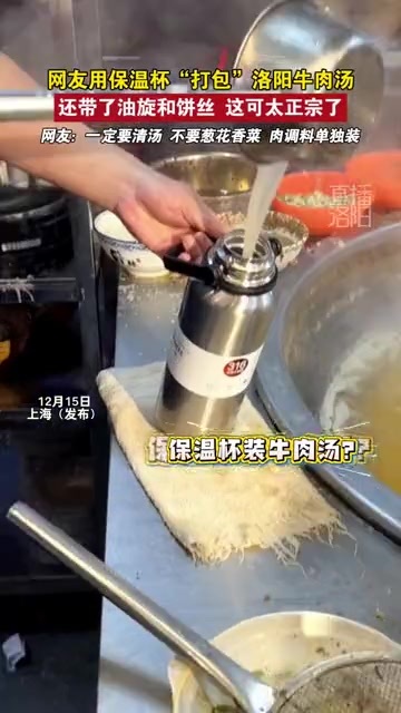 網友用保溫杯“打包”洛陽牛肉湯,還帶了油旋和餅絲,網友:一定要清湯 不要蔥花香菜 肉調料單獨裝!