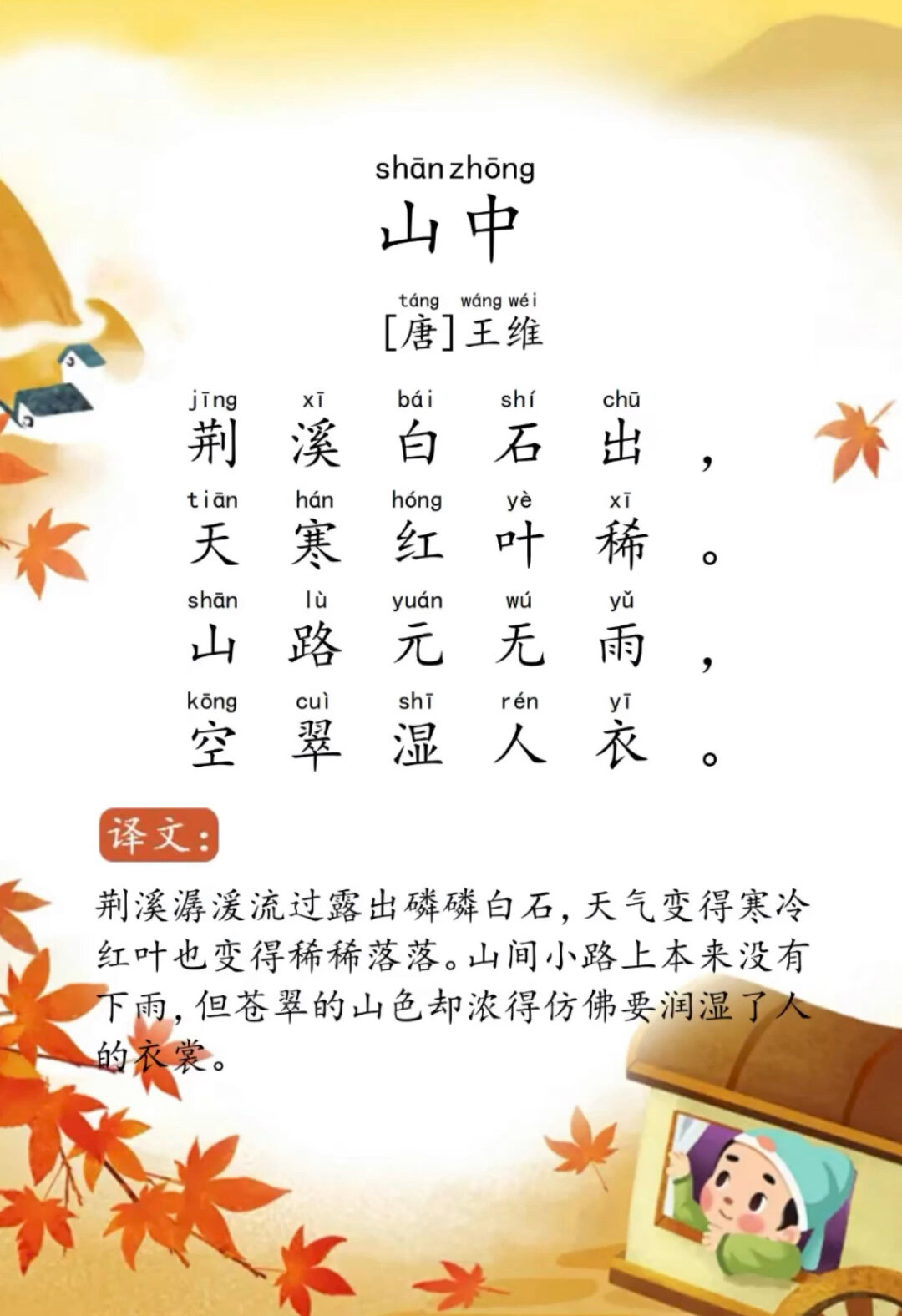 緊接著,“天寒紅葉稀”,鏡頭微微拉開,從溪石的特寫轉向了山林的中景。秋日的絢爛已然謝幕,僅存的幾片紅葉在寒意中顯得格外醒目而珍稀。“稀”字與上句的“出”字形成情緒的共振:繁華褪去,喧囂沉寂,世界變得疏朗、通透,甚至有些寂寥。這“稀”不僅是數量的減少,更是一種美學上的“留白”,它為接下來更充盈的感知體驗,騰空了心理空間。