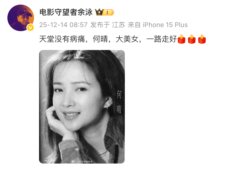 12月13日,著名演員何晴在北京安然離世,享年61歲。