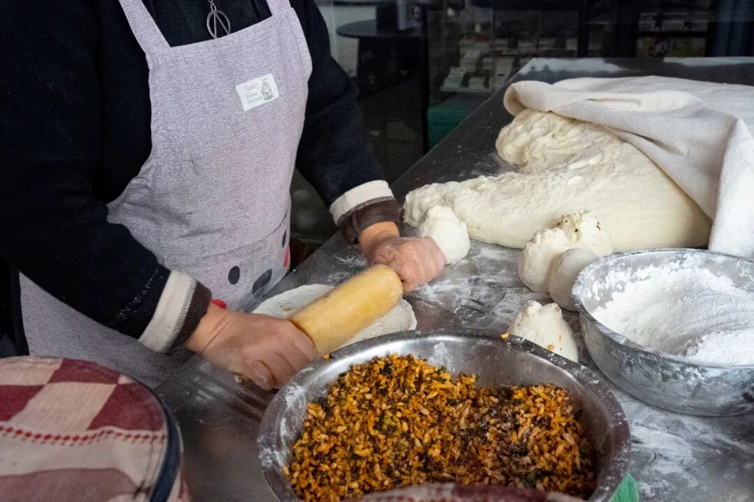 烤餅的魅力,在于用最樸素的食材,烤出地道風味。餡料是經典的梅干菜扣肉餡,咸甜風味、肥而不膩,或者蔥肉組合,將本地土豬肉剁碎,拌上翠綠的香蔥,簡單調味,便是靈魂所在。