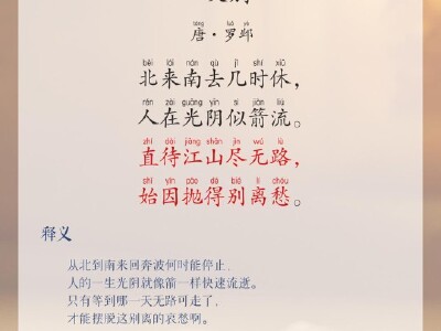 《嘆別》是唐代詩人羅鄴的一首七言絕句,通過"北來南去幾時休""人在光陰似箭流"等意象,抒發了對時光飛逝與離別愁緒的感慨。全詩語言簡練,情感深沉。該作品收錄于《新唐書藝文志》傳世詩集一卷。