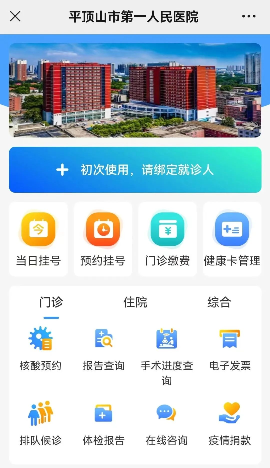 第二步:點擊“診療服務”進入下列頁面,點擊“初次使用,請綁定就診人”→填寫真實信息→注冊成功