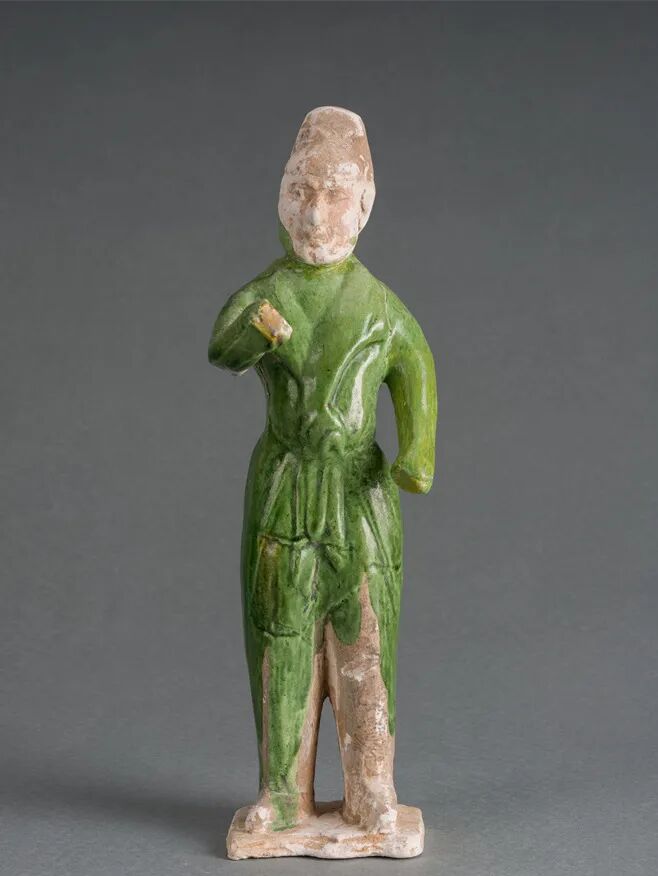 這件綠釉胡人俑高32厘米。俑像濃眉深目,高鼻絡腮,頭戴黑色幞頭,身穿翻領窄袖長袍,腰間束帶,足蹬長靴。其面容與裝束帶有鮮明的西域特征,是當時工匠對旅居洛陽的胡人群體的真實刻畫。俑身所施的綠釉,歷經歲月仍保存完好。