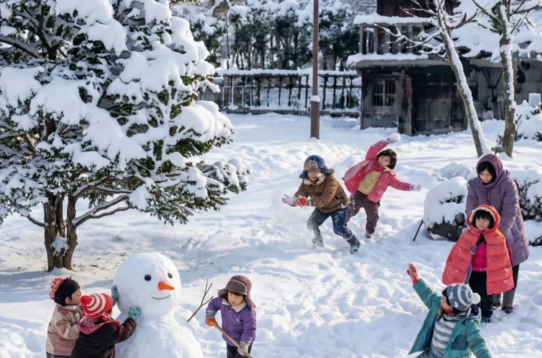 雪落無聲,卻讓記憶里的聲音格外清晰。是父親在堂屋里“嗶剝”撥弄炭火盆的聲響,火星子偶爾濺起,映亮他專注的側臉;是母親在廚房里準備晚飯,鍋碗瓢盆的叮當,混雜著腌菜燒肉的咸香,從門縫里絲絲縷縷地鉆出來,與雪的清冽氣息奇妙地融合;是鄰家伯伯掃雪時,竹帚劃過青石板路的“沙沙”聲,沉穩而富有節奏,像是為這靜謐的雪夜打著拍子。最熱鬧的當然是孩子們。