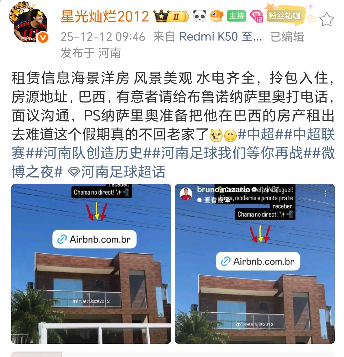 根據博主“星光燦爛2012”消息,假期未返回巴西的河南外援納薩里奧,近日在社交媒體上掛出租賃信息,要將巴西的別墅出租。