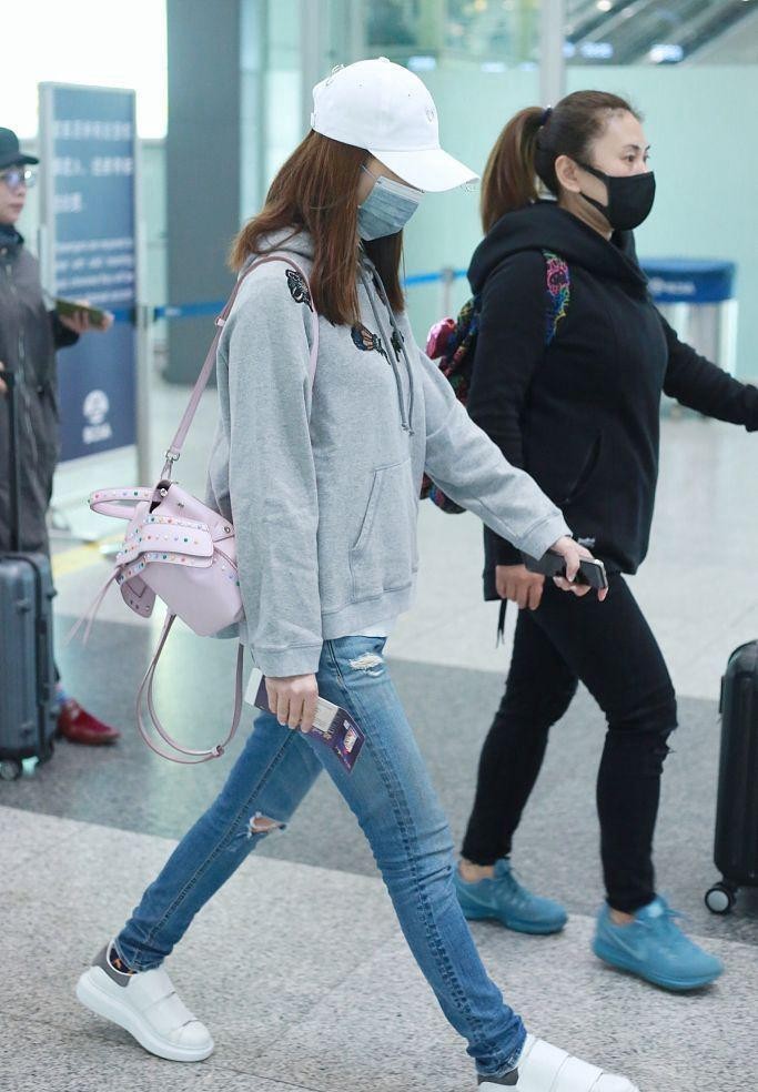 連帽型衛(wèi)衣的帽子基本會融入抽繩設計,目的是在必要時候調整松緊度。身上這件衛(wèi)衣袖子除了寬松這個點之外,落肩設計也肉眼可見,兩者同時出現(xiàn),既可以隱藏手臂上不招人喜歡的拜拜肉,也可隱藏溜肩問題。粉色衛(wèi)衣的衣長在臀部以上,我們可看到里層還有白色面料,所以大膽猜測,林心如上半身選擇了疊穿。