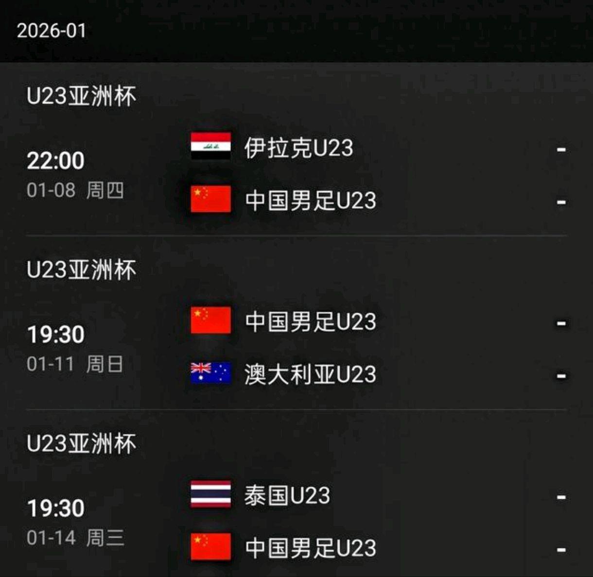 據了解,2026年U23亞洲杯決賽階段將于?2026年1月7日至25日在沙特阿拉伯舉行。共有16支球隊參加這項比賽,中國U23男足與澳大利亞U23、伊拉克U23、泰國U23同分在D組。根據最新的賽程安排,2026年中國男足首戰已經出爐!中國隊將在北京時間2026年1月8日晚22點,迎來對陣伊拉克U23的對決。