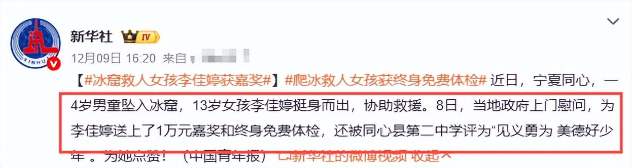 有關(guān)部門(mén)得知情況后,為李佳婷送上一萬(wàn)元嘉獎(jiǎng)和終身免費(fèi)體檢。