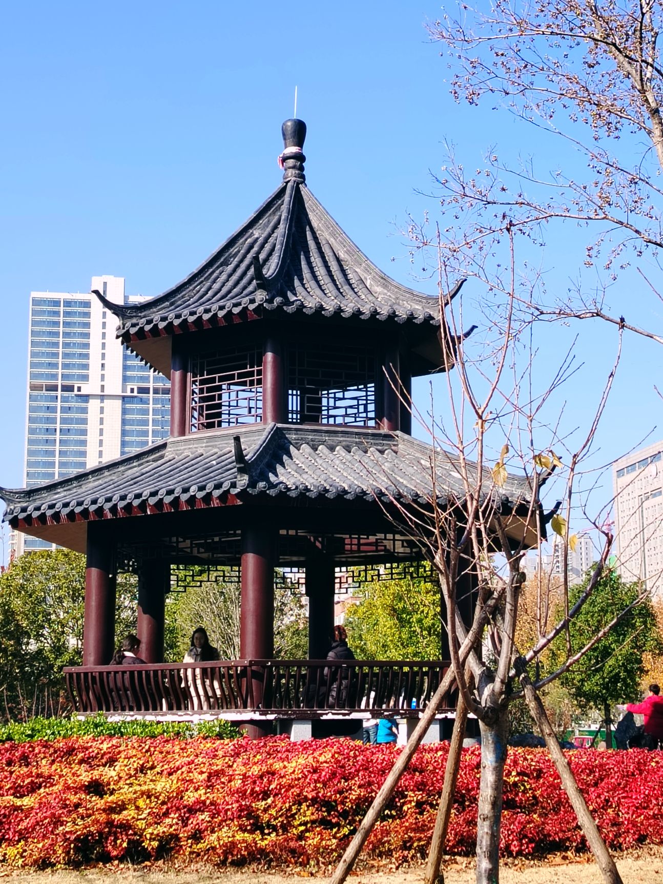我隨人流登樓。木梯一級一級,踩上去發出鈍鈍的“咚咚”聲,像是從時空那頭傳回來的回應。頂層風大,俯瞰下去,公園內外連成一片:這邊是飛檐,那邊是高樓;這邊是曲橋亭榭,那邊是車水馬龍。古今在此握手,誰也沒搶誰的戲。