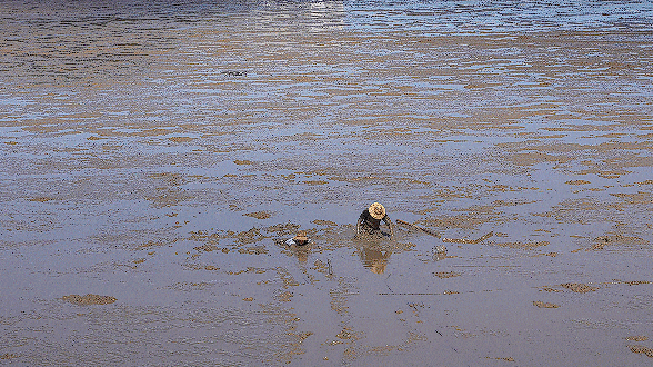 一名在河邊撿田螺的男子