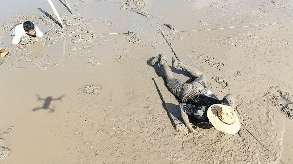 兩位實(shí)驗(yàn)者模擬陷入淤泥至腰部,使用灘涂附近的常見(jiàn)物自救。實(shí)驗(yàn)者A將空塑料桶緊抱胸前并壓在身下,利用浮力拖住身體,防止繼續(xù)下陷,隨后他又借助身旁的長(zhǎng)桿,從淤泥中爬了出來(lái),繼續(xù)抱著空塑料桶向前爬行自救。